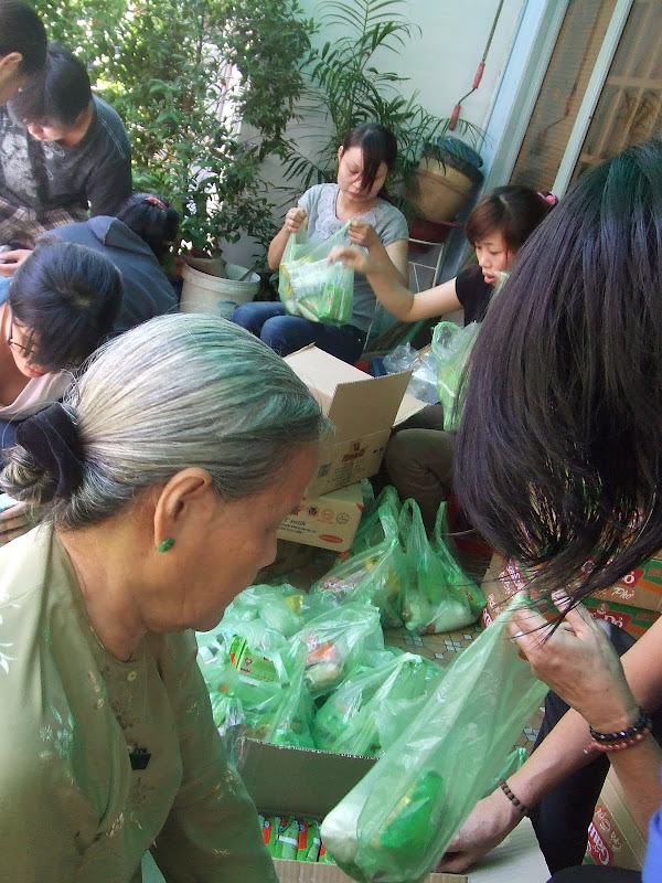 Phát 200 phần quà, mỗi phần gồm = 1 bánh giò + 1 bịch sữa + 2 gói mì = 16.500 VNĐ
