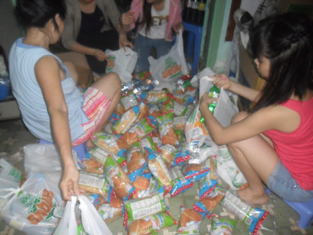 1 phần quà gồm: 1 bịch kẹo + 2 bánh mì ngọt + 1 nước suối + 1 Coca + 3 mì gói = 32.500 VNĐ/phần.